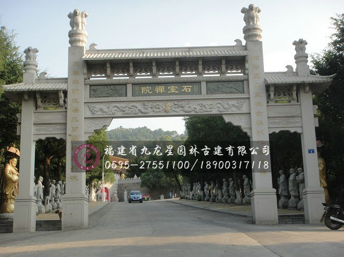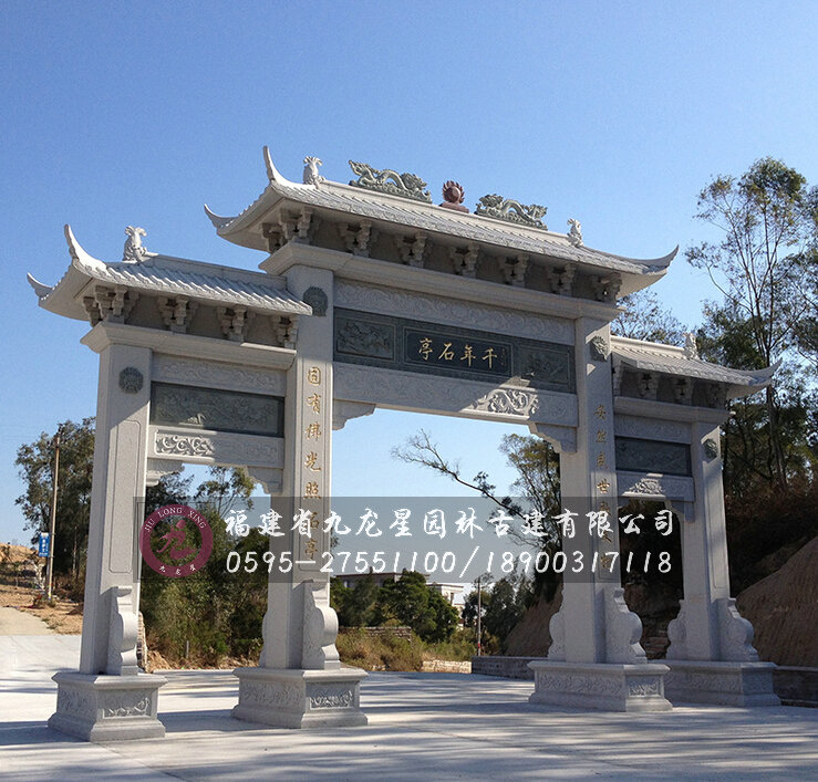 石雕牌坊即石頭修建的牌坊,是一種裝飾建筑物,也是雕刻藝術(shù)的一種。常見于古代陵園,如北京明代陵墓外面的大紅門前,有石牌坊一座,整個(gè)牌坊為五間六柱十一樓,結(jié)構(gòu)勻稱和諧,造型美觀大方。現(xiàn)代石牌坊常用于村鎮(zhèn)入口,寺廟景區(qū)入口等。主要作為標(biāo)志性的裝飾建筑物,在設(shè)計(jì)上也沒有古建石雕牌坊那么講究。